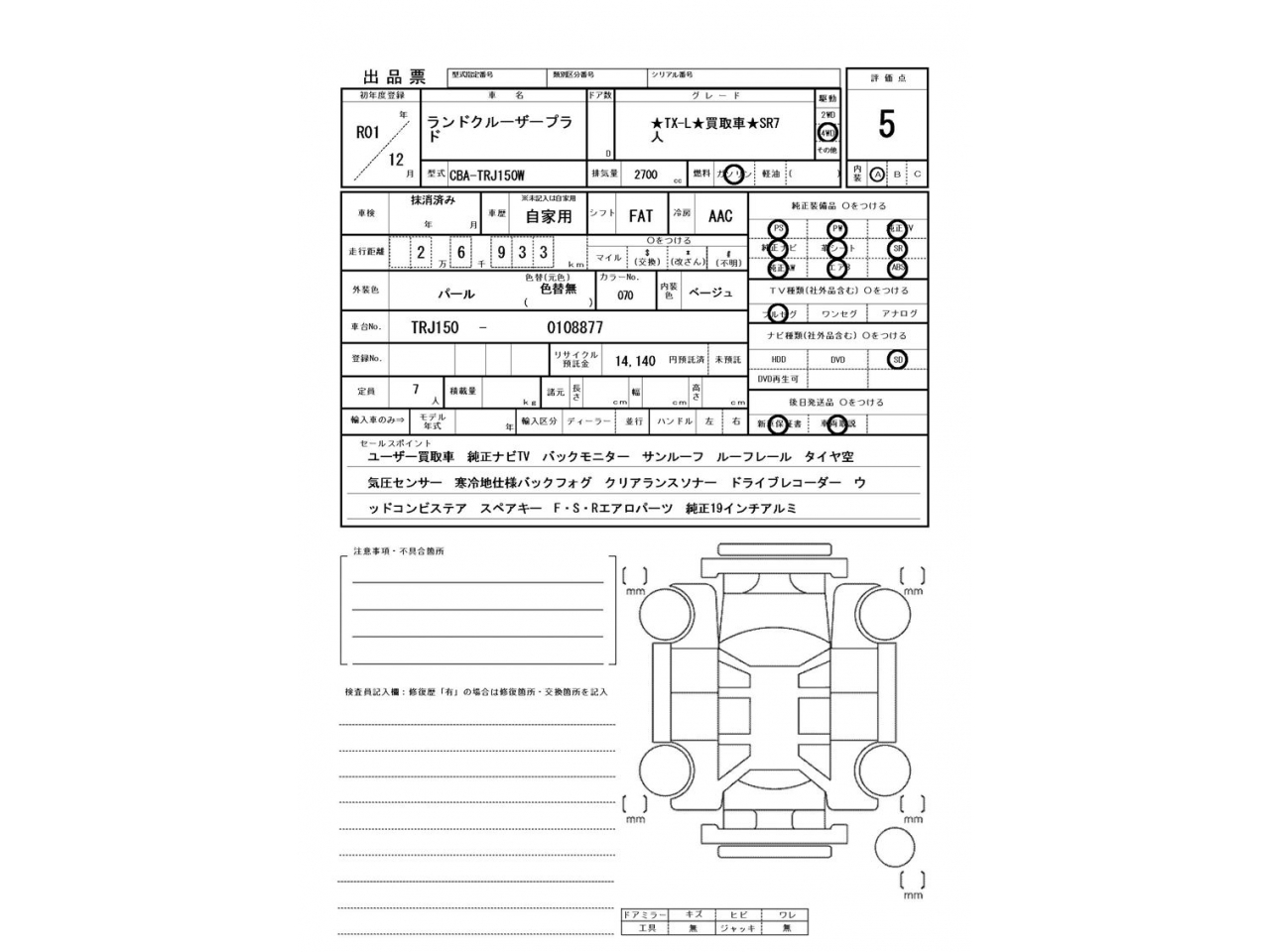 | Auction | AUCNET Kyokyuzaiko | Chassis No. | TRJ150-0108877 | ||