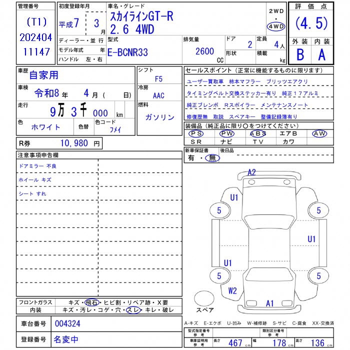 | Auction | JU Kyokyuzaiko | Chassis No. | BNCR33-004324 | ||