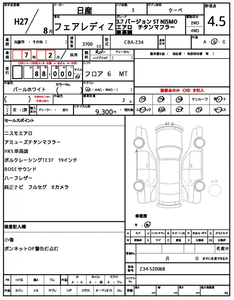 | Auction | Quick Kyoyuzaiko | Chassis No. | Z34-520068 | ||