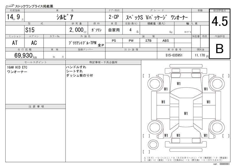 | Auction | TAA / CAA Kyoyuzaiko | Chassis No. | S15-035951 | ||