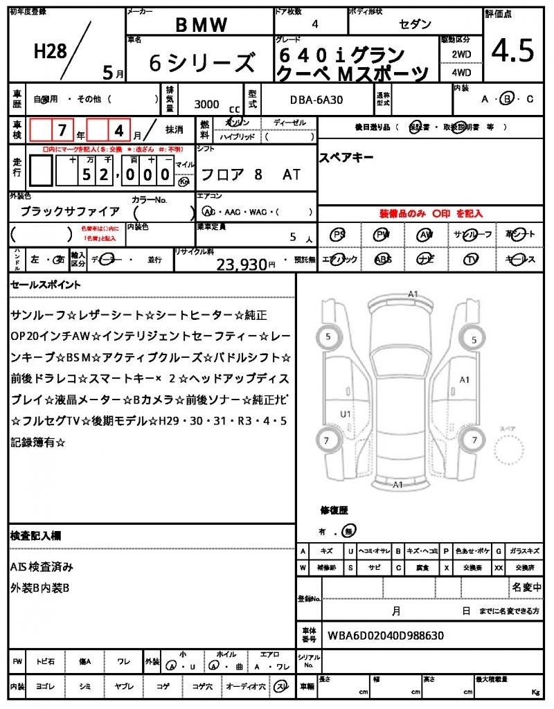 | Auction | Quick Kyoyuzaiko | Chassis No. | WBA6D02040D988630 | ||