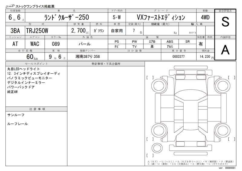 | Auction | TAA / CAA Kyoyuzaiko | Chassis No. | TRJ250W-0003377 | ||