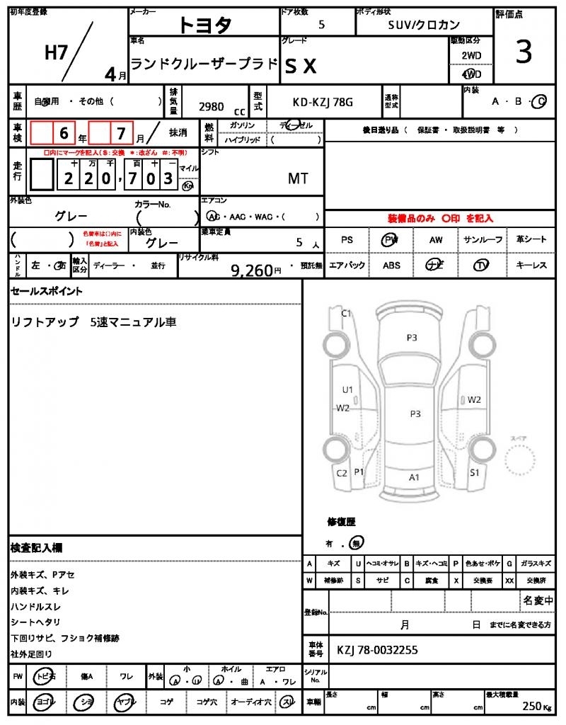 | Auction | Quick Kyoyuzaiko | Chassis No. | KZJ78-0032255 | ||