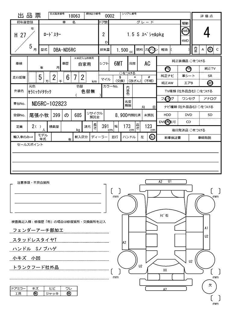 | Auction | AUCNET Kyoyuzaiko | Chassis No. | ND5RC-102823 | ||