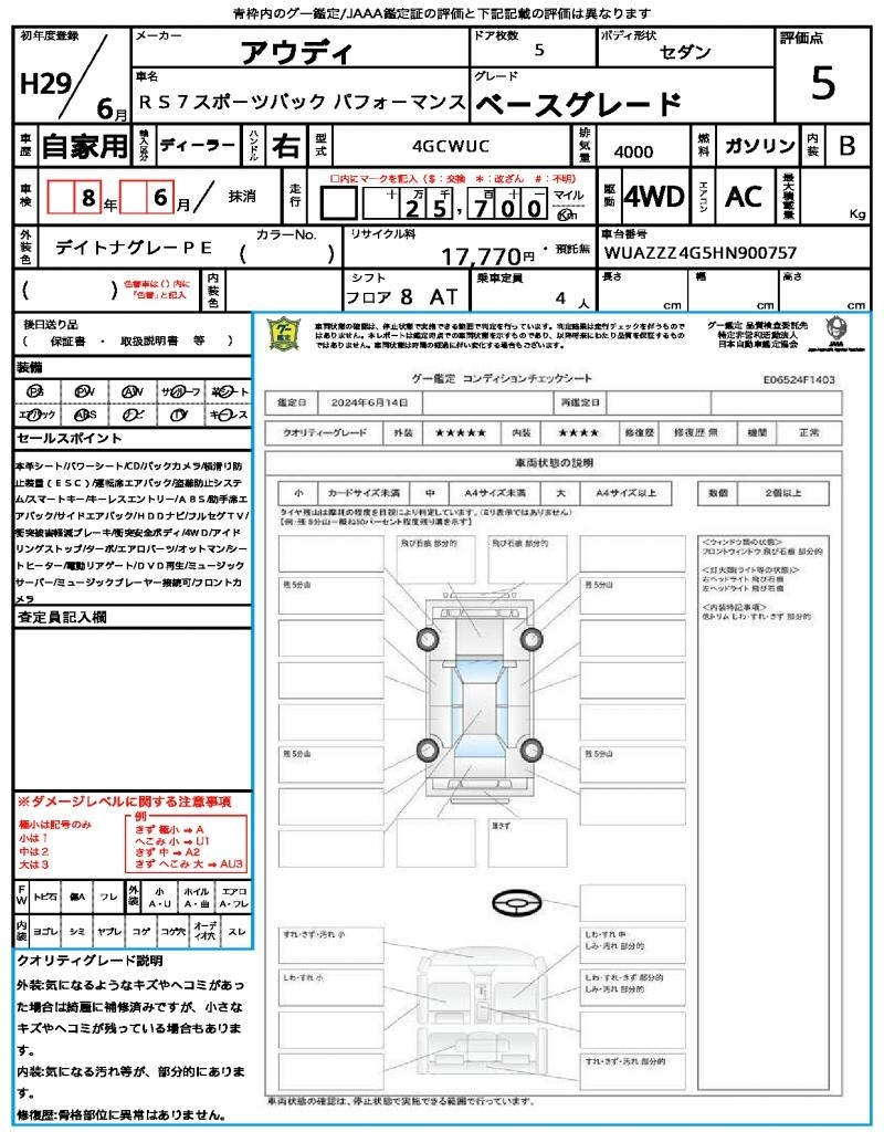 | Auction | Quick Kyoyuzaiko | Chassis No. | WUAZZZ4G5HN900757 | ||