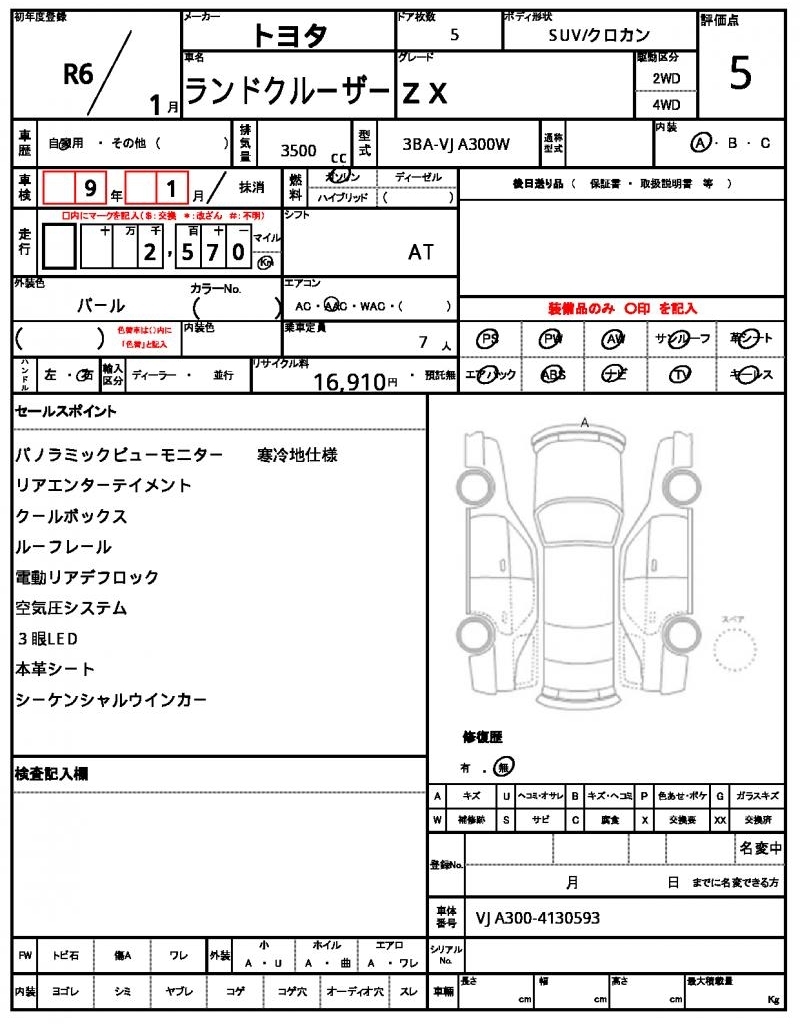 | Auction | Quick Kyoyuzaiko | Chassis No. | VJA300-4130593 | ||
