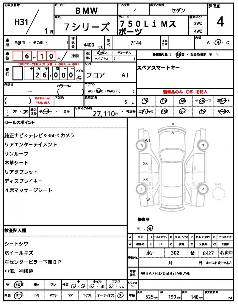 | Auction | Quick Kyoyuzaiko | Chassis No. | WBA7F02060GL98796 | ||