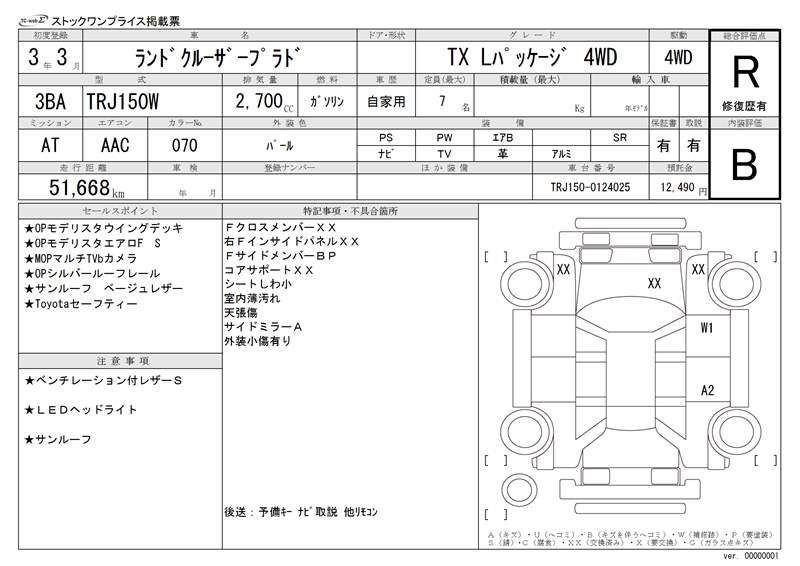 | Auction | TAA / CAA Kyoyuzaiko | Chassis No. | TRJ150-0124025 | ||