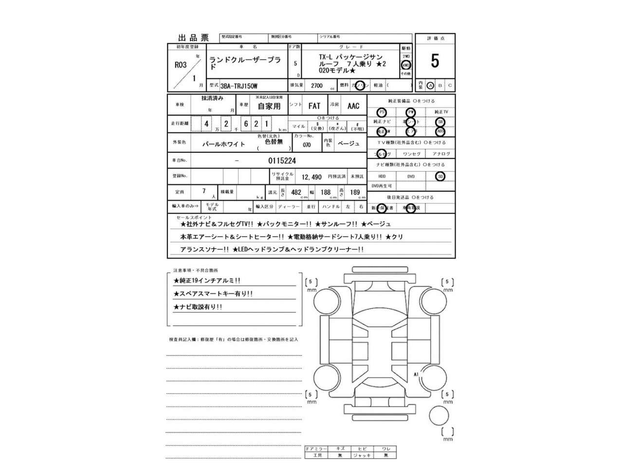 | Auction | AUCNET Kyoyuzaiko | Chassis No. | TRJ150-0115224 | ||