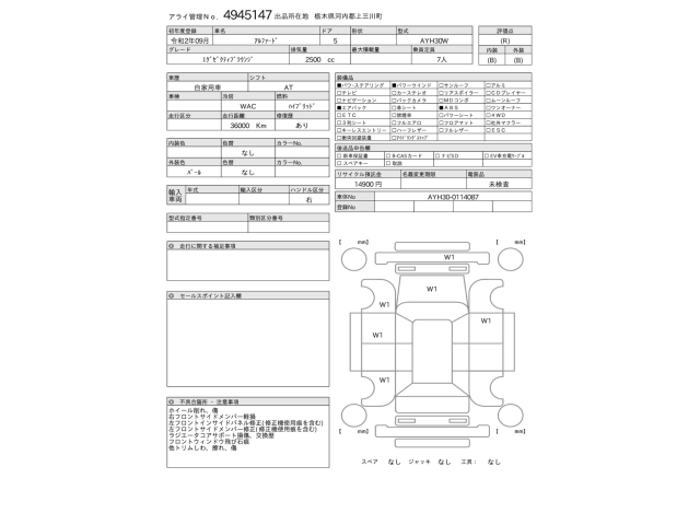 | Auction | ARAI Kyoyuzaiko | Chassis No. | AYH30-0114087 | ||