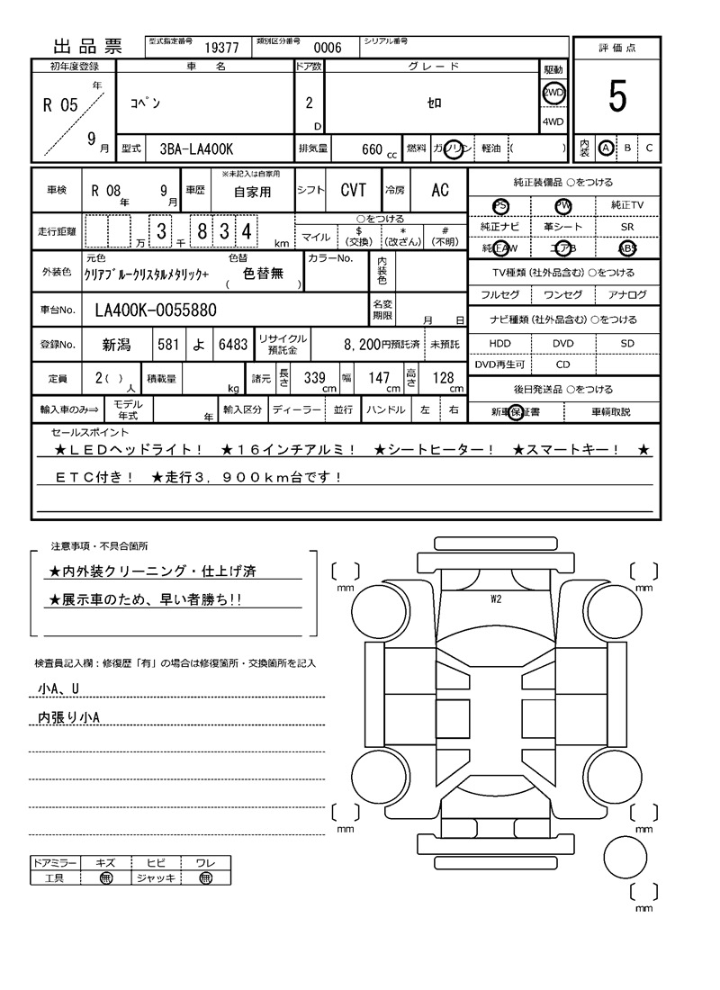 | Auction | AUCNET Kyoyuzaiko | Chassis No. | LA400K-0055880 | ||