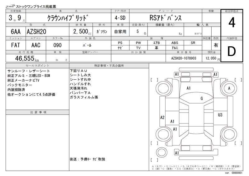 | Auction | TAA / CAA Kyoyuzaiko | Chassis No. | AZSH20-1078903 | ||