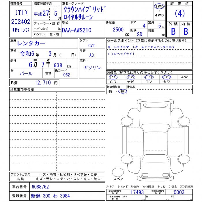 | Auction | JU Kyoyuzaiko | Chassis No. | AWS210 6088762 | ||
