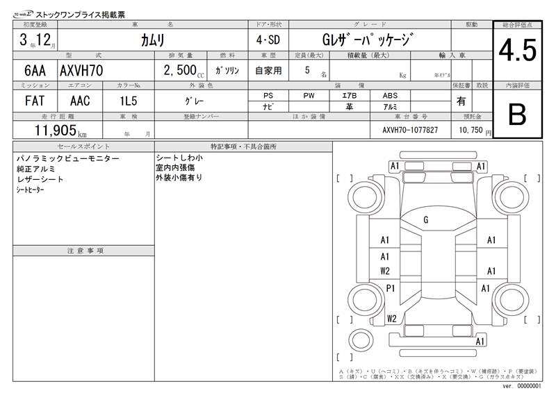 | Auction | TAA / CAA Kyoyuzaiko | Chassis No. | AXVH70-1077827 | ||