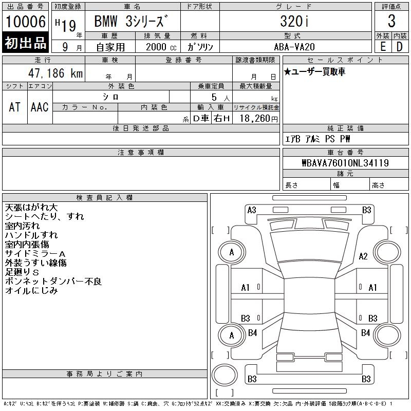 | Auction | CAA Tokyo One Price | Chassis No. | WBAVA76010NL34119 | ||