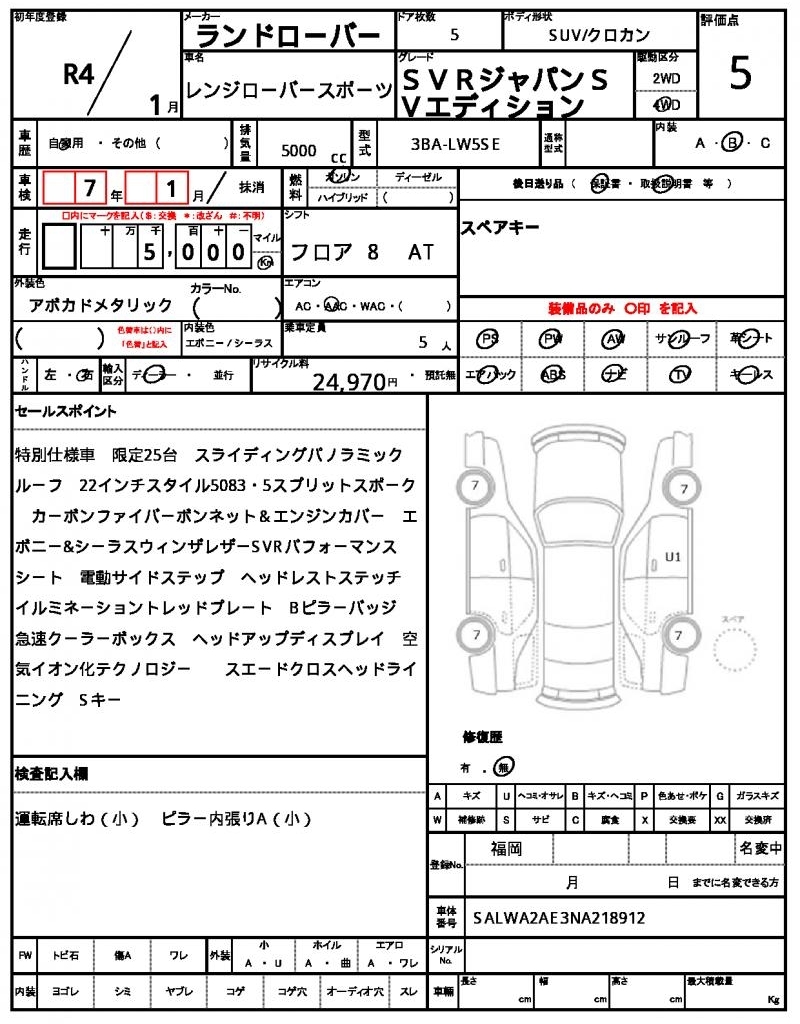 | Auction | Quick Kyoyuzaiko | Chassis No. | SALWA2AE3NA218912 | ||