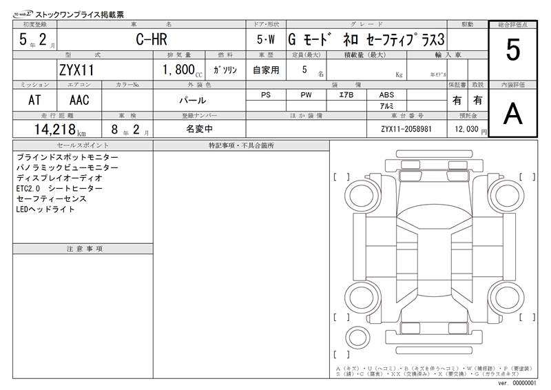 | Auction | TAA / CAA Kyoyuzaiko | Chassis No. | ZYX11-2058981 | ||
