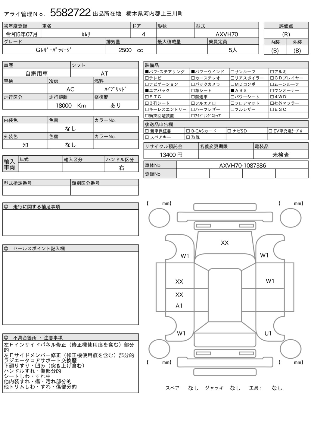 | Auction | ARAI Kyoyuzaiko | Chassis No. | AXVH70-1087386 | ||