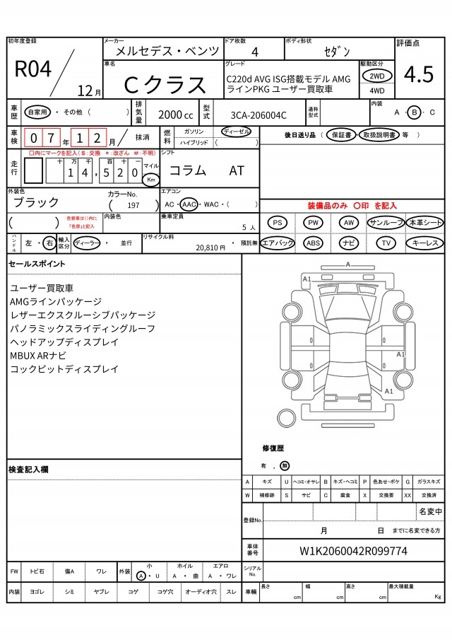 | Auction | Quick Kyoyuzaiko | Chassis No. | W1K2060042R099774 | ||