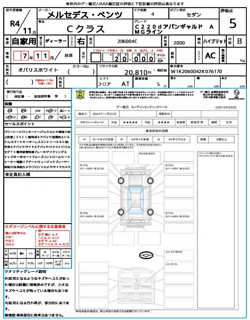 | Auction | Quick Kyoyuzaiko | Chassis No. | W1K2060042R076170 | ||