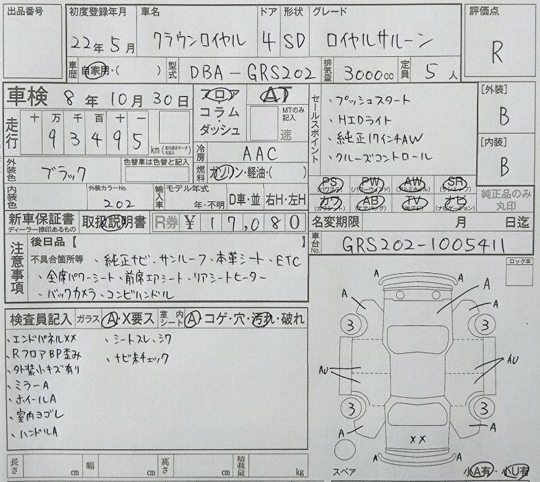 | Auction | LAP Kyoyuzaiko | Chassis No. | GRS202-1005411 | ||